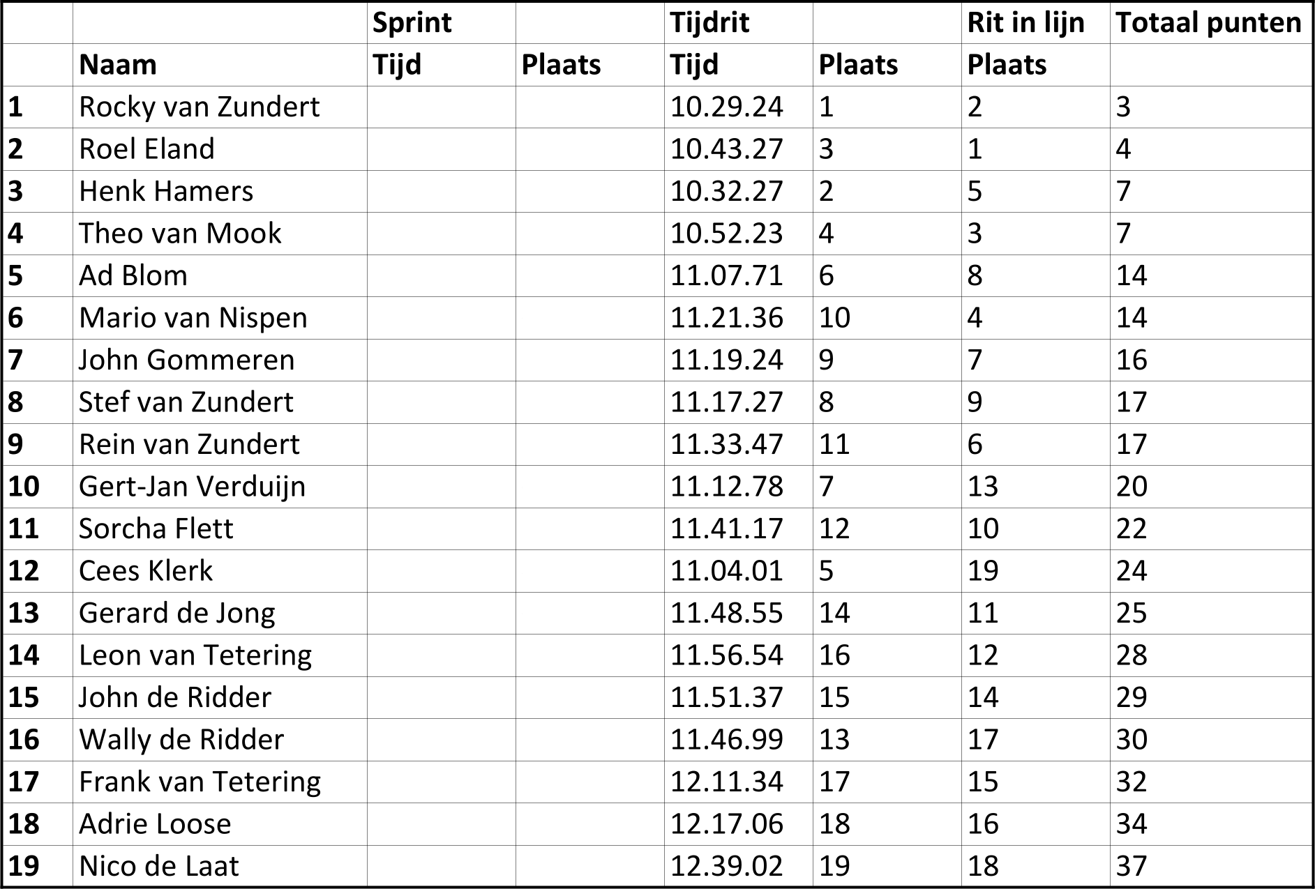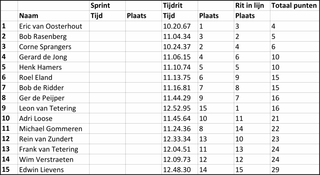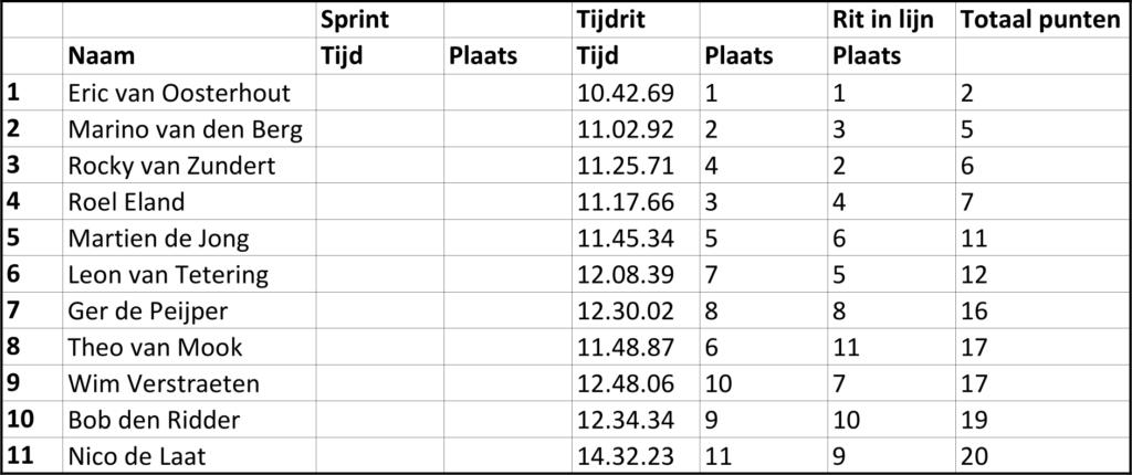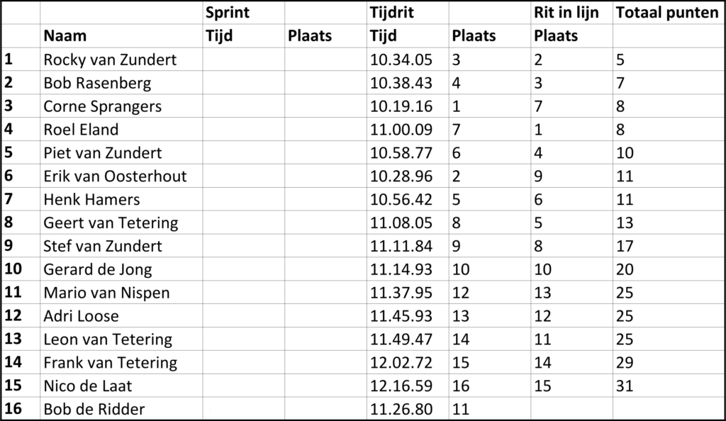 | Ranking | Naam | Sprint | Tijdrit | Rit in lijn Plaats |