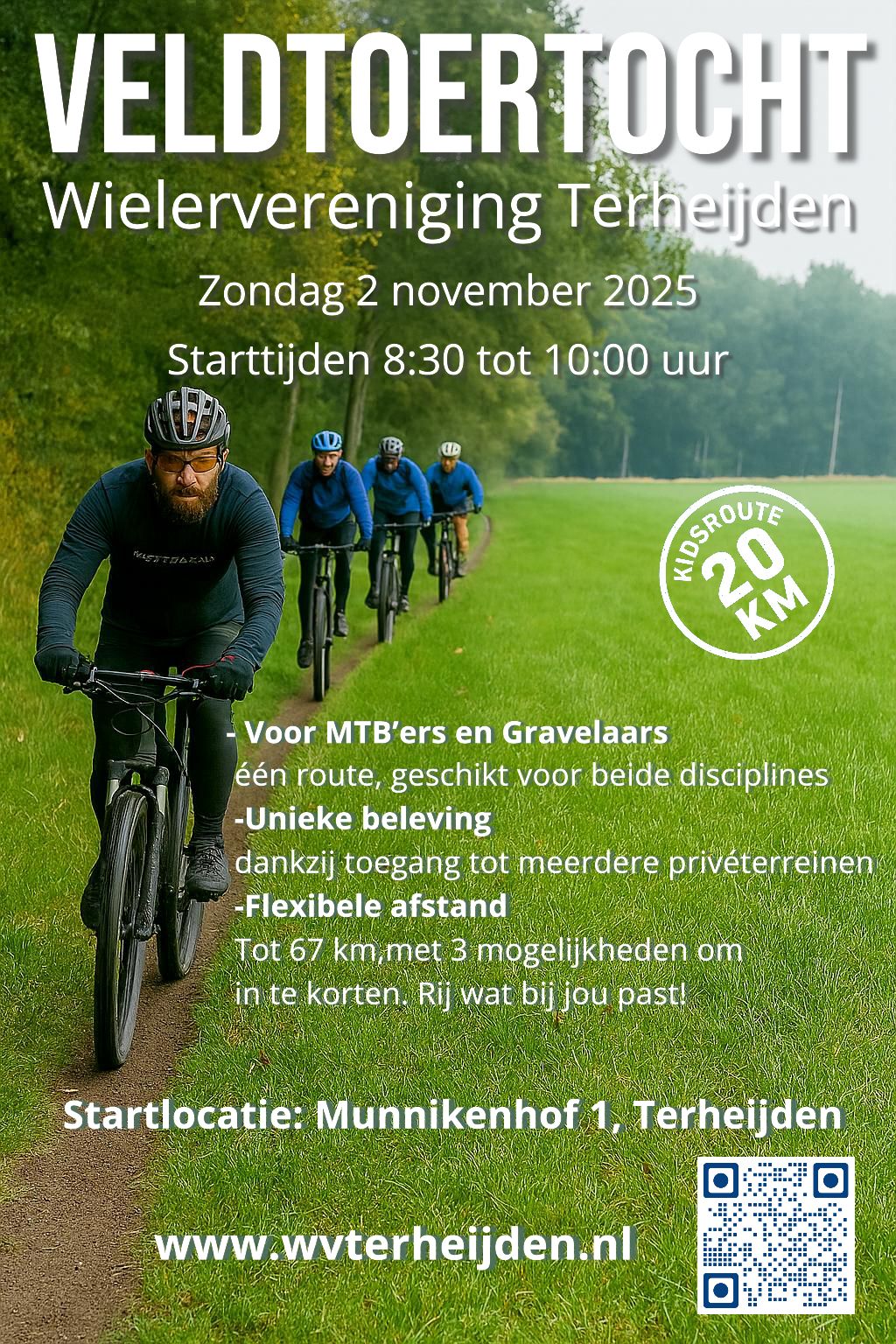 Op zondag 2 november organiseert Wielervereniging Terheijden voor de 27ekeer haar jaarlijkse Veldtoertocht. Ook dit jaar hebben we een uniek parcours dat alleen op deze dag gereden kan worden. De tocht brengt de deelnemers deze keer niet alleen door de bossen, maar ook door de prachtige polders en over privéterreinen die normaal niet toegankelijk zijn. De route is een gevarieerde mix van onverharde polderwegen, kasseien, dijkjes, gravelpaden en bospaden. Het slotstuk van de tocht loopt,zoals al vele jaren, langs het Markkanaal.In delaatste kilometer ligt misschien wel de grootste uitdaging van deze tocht. Hier mag je proberen al fietsend steil omhoog lang de zijkant het talud van de brug op te rijden. Dat is ieder jaar veel deelnemers gelukt. Maar na 67 kilometer is natuurlijk niet iedereen even fris meer, dus het lukt ook weleens niet. Durf jij dit aan?